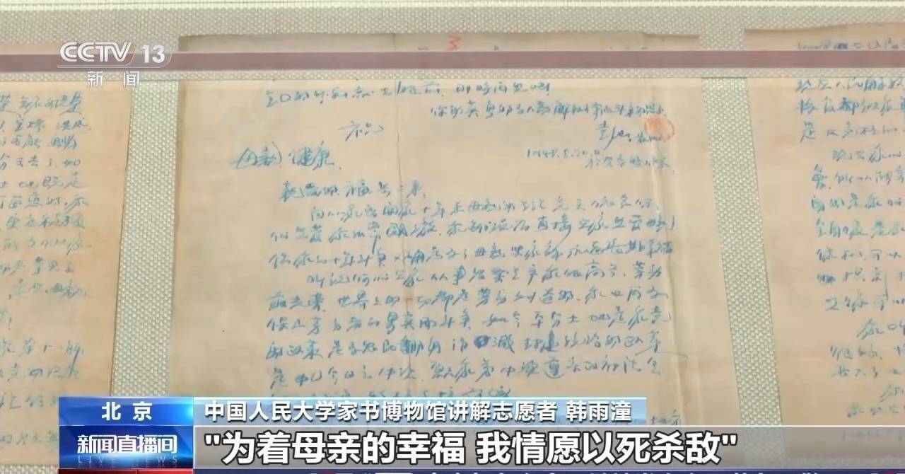 在中国人民大学,很多像沈明辉一样的青年学子走进家书博物馆,参与讲解服务,协助整理家书,从字里行间读懂背后的家国故事。馆中珍藏的不仅有抗战英雄的家书,也有许多为抗战尽己所能的普通民众的家书。在这些书信中,天下兴亡,匹夫有责的爱国情怀,视死如归、宁死不屈的民族气节,与对亲人的真挚情感交织在一起。触摸这些泛黄的信纸,每位学生都收获着独特而深刻的心灵感受。